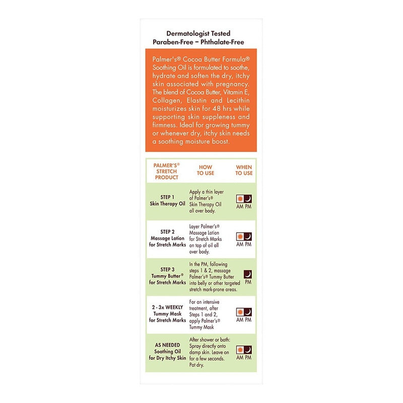 Tratamiento para la piel seca y con picazón: este aceite calmante está formulado exclusivamente para calmar, hidratar y suavizar la piel seca y con picazón asociada con el embarazo; viene en una práctica botella de spray con bomba para un uso fácil Fórmula especial: este aceite dermatológico probado está hecho con una combinación de manteca de cacao, vitamina E, colágeno, lecitina y elastina para calmar y suavizar la piel mientras mantiene la elasticidad y la firmeza de la piel Los mejores ingredientes: nos esforzamos por utilizar solo los mejores ingredientes naturales y crudos para ofrecerte cabello y piel suaves, hidratados y hermosos; apoyamos la producción sostenible de manteca de karité y cacao y aceite de coco en todo el mundo Elige lo que es real: nuestros productos de belleza y tratamientos para el cabello y la piel cuentan con ingredientes vegetales de alta calidad en fórmulas que realmente funcionan para hidratar y suavizar, desde bálsamo labial hasta jabón de barra hasta mantequilla corporal Palmer's Cuidado de la piel: nuestras líneas de productos de manteca de cacao, aceite de coco, manteca de karité, aceite de oliva y vitamina E incluyen cremas, bálsamos, lociones, aceites y jabones para manos y cuerpo, cara, labios, cuidado solar, cuidado del cabello y cuidado del embarazo y estrías
