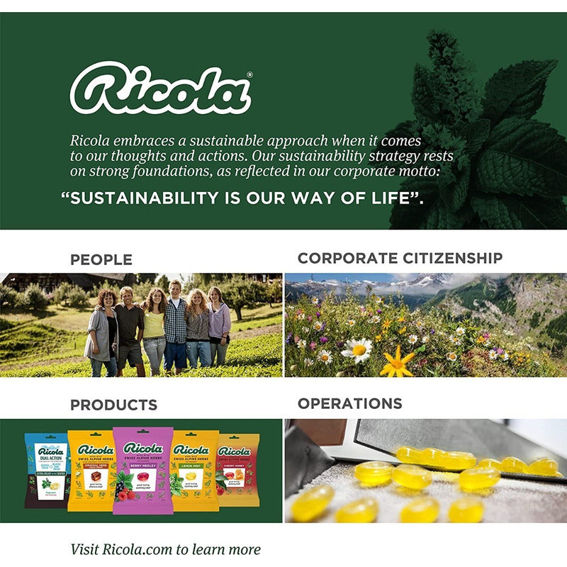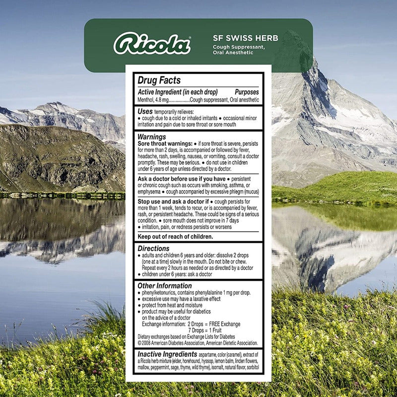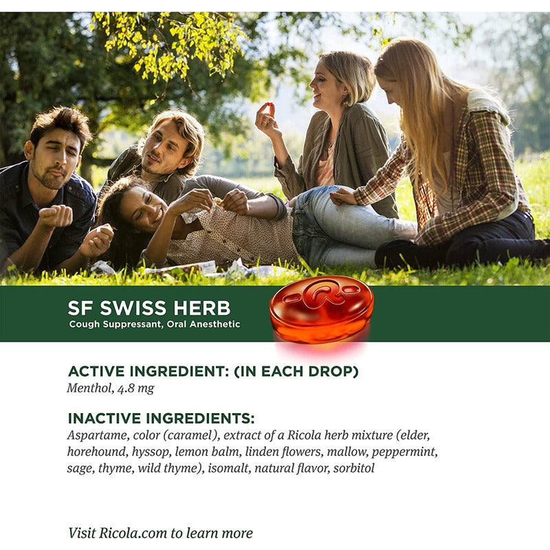 GOTAS DE GARGANTA DE HIERBAS SUIZAS ORIGINALES SIN AZÚCAR DE RICOLA: durante casi un siglo, Ricola ha estado ayudando a que las gargantas se sientan mejor de forma natural. Usando solo hierbas de alta calidad cultivadas en lo alto de las montañas suizas para hacer nuestra mundialmente famosa pastilla para la tos. Junto con su agradable sabor a hierbas y su forma cuadrada única, le brinda un alivio calmante de la tos debido a resfriados o gripes, y también puede ayudar con la picazón de garganta por alergias. Ingrediente activo (en cada gota): mentol, 4,8 mg MEZCLA DE HIERBAS SUIZAS: La fórmula única de Ricola utiliza una mezcla secreta de diez hierbas cultivadas en las montañas suizas con pautas de agricultura natural. Nuestras pastillas para la tos y el dolor de garganta ofrecen el alivio calmante del mentol con agradables ingredientes a base de hierbas. GOTAS DE GARGANTA RICOLA: Nuestras pastillas para la garganta han sido confiables para la tos y el dolor de garganta por resfriados durante más de 80 años. Ricola es la opción original para el alivio, con mentol calmante y calmante y el delicioso sabor de nuestra mezcla de hierbas de montaña suiza. Gotas de hierbas para la tos: se ha confiado en Ricola para el alivio de la tos y el dolor de garganta durante generaciones. Las propiedades calmantes de las pastillas para la tos de Ricola combinan el sabor de las hierbas cultivadas en los Alpes suizos como la menta, el tomillo y la melisa en estas sabrosas gotas. CALIDAD Y SOSTENIBILIDAD: La principal prioridad de Ricola es garantizar que nuestras materias primas sean de la más alta calidad y mantener los estándares excepcionales al producir nuestras diversas especialidades de hierbas. Por eso, nuestras hierbas se cultivan con métodos naturales en las montañas suizas. Ricola adopta un enfoque sostenible cuando se trata de nuestros pensamientos y acciones; nuestra estrategia de sustentabilidad descansa sobre bases sólidas, como se refleja en nuestro lema corporativo, 'La sustentabilidad es nuestra forma de vida' Que incluye tu compra? 1 bolsa caramelos ricola x19 libres de azucar
