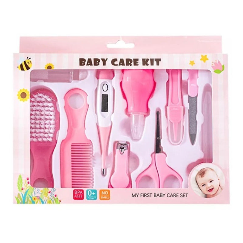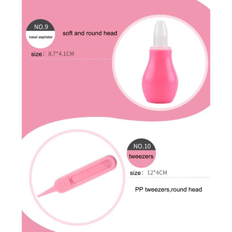 Cepillo para el cabello de cerdas suaves Peinilla para el cabello Extractor nasal con punta de silicona blanda Gotero medidor para medicinas Termómetro digital con punta flexible Cepillo bucal para utilizar con dedo en silicona con masajeador Cortaúñas para bebe Tijeras con punta redonda para las uñas Lima especial para uñitas delicadas